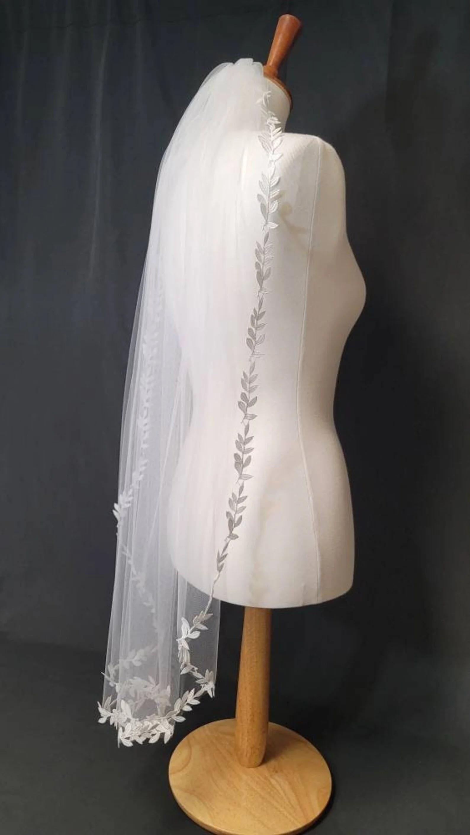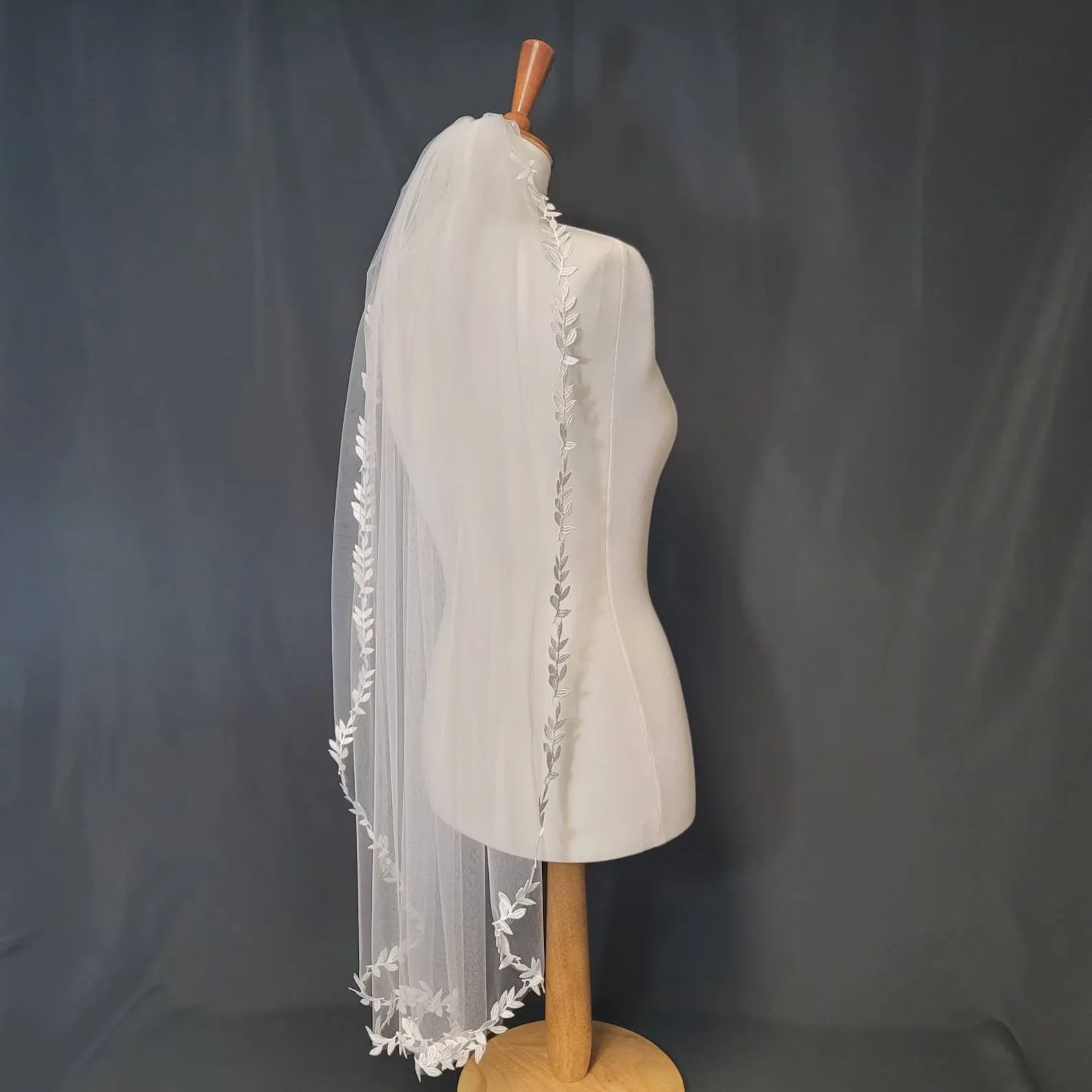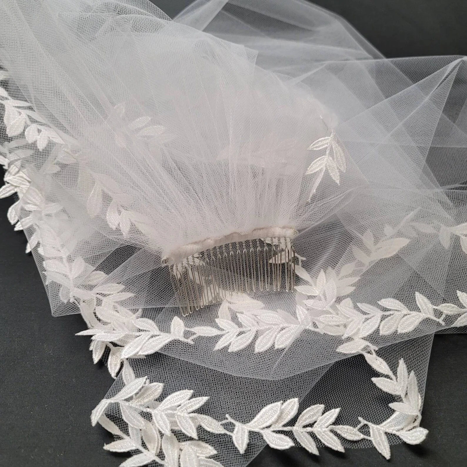 One tier veil edged in a leaf motif lace. High quality 54 inch tulle, attached to a 3 inch metal comb.