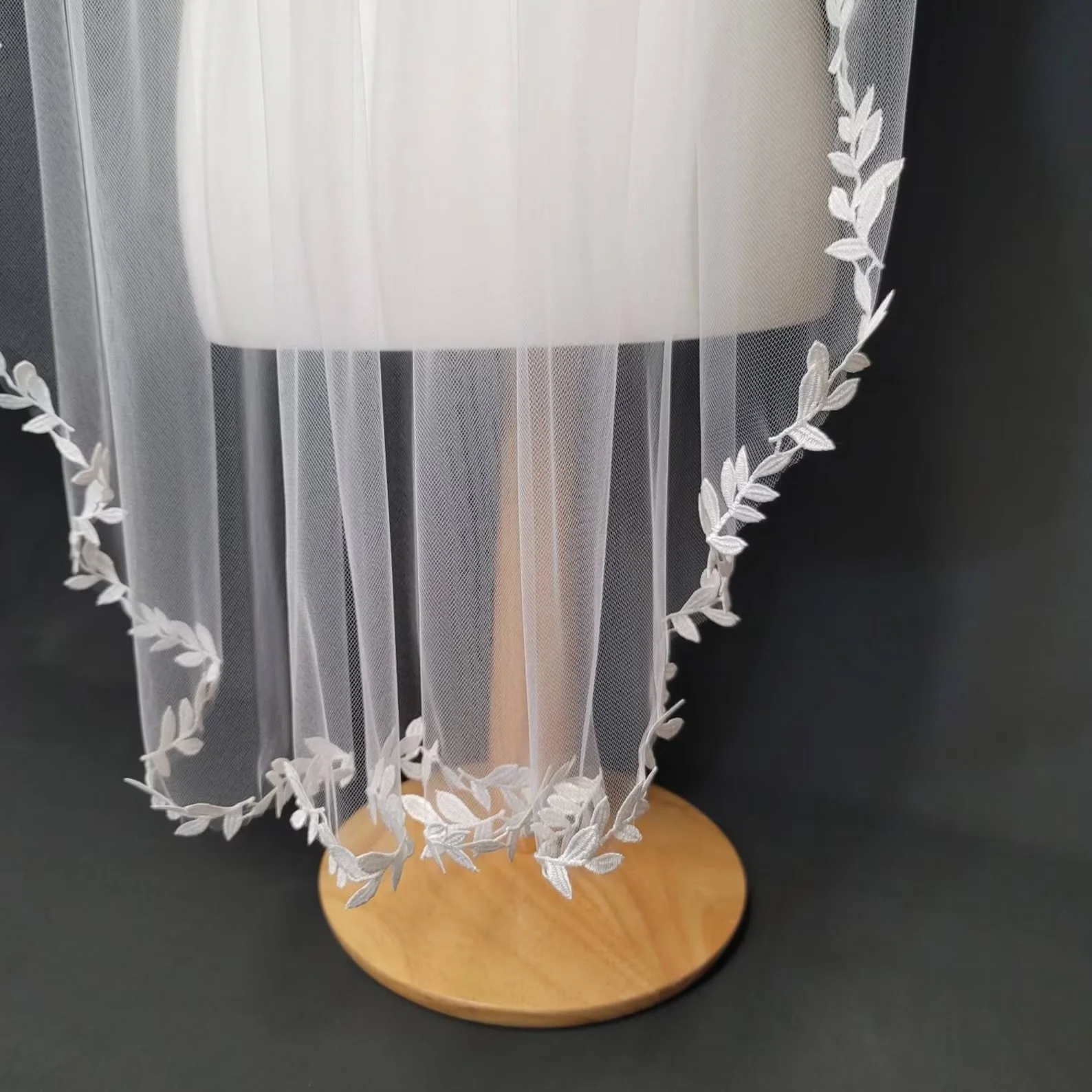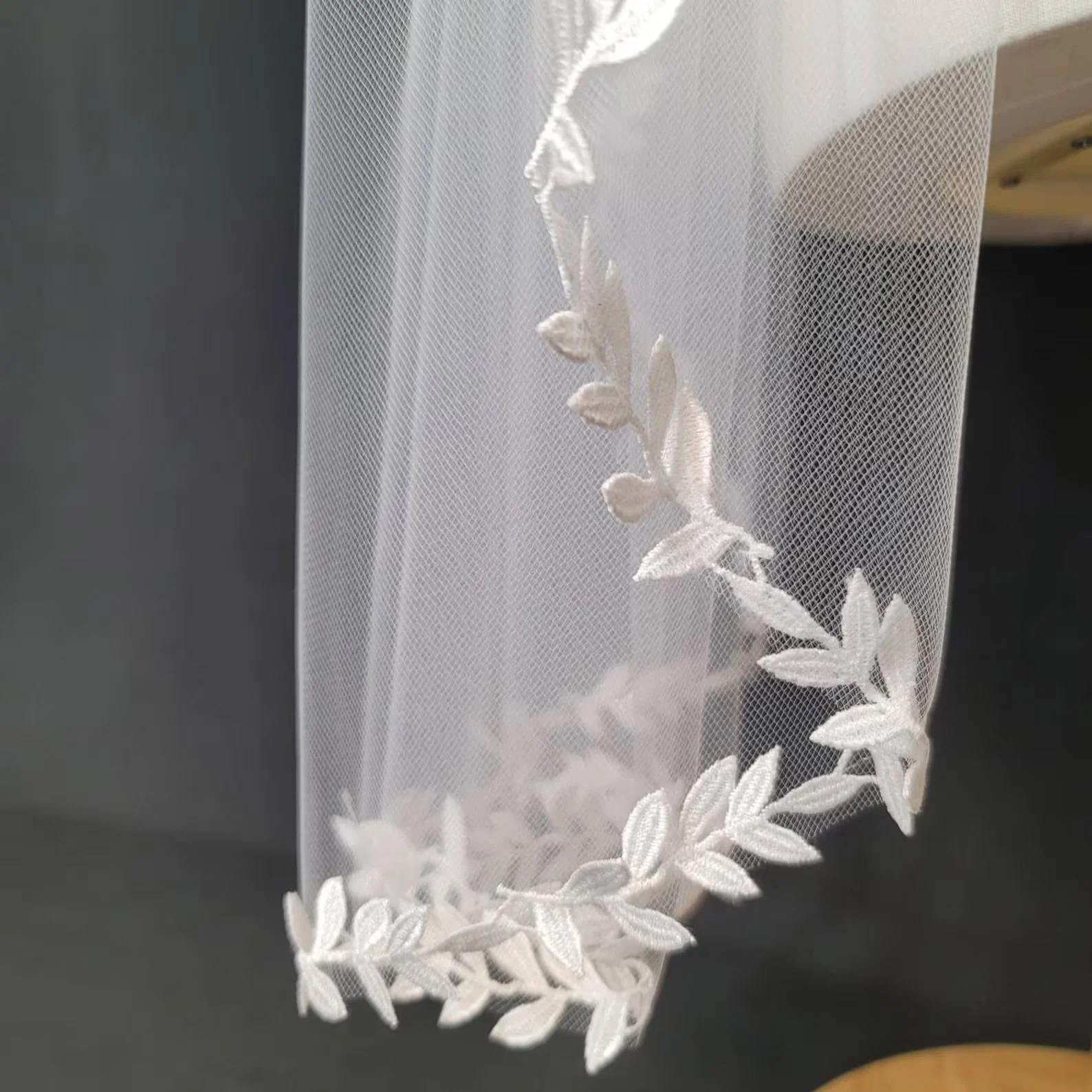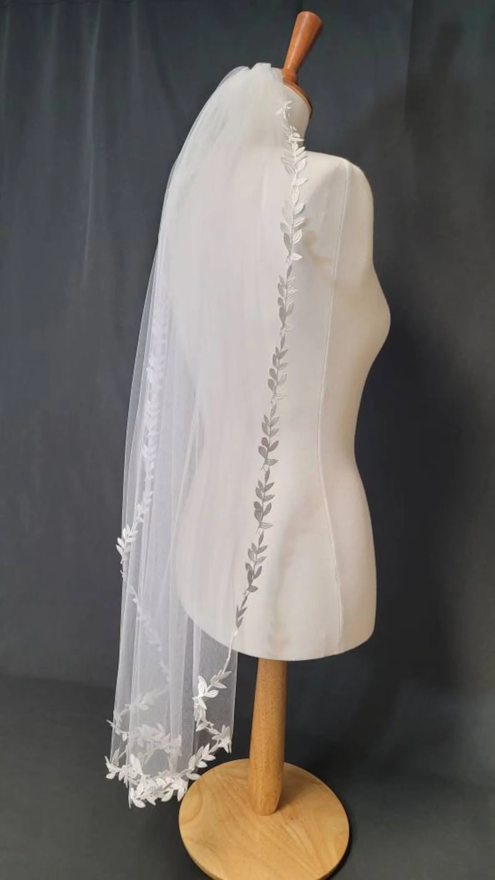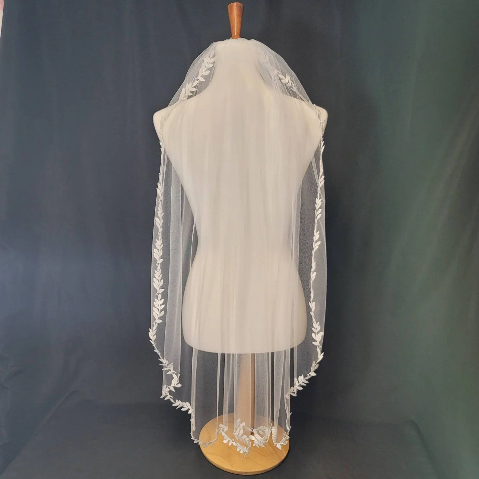 One tier veil edged in a leaf motif lace. High quality 54 inch tulle, attached to a 3 inch metal comb.